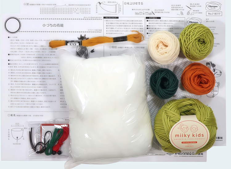 「小づちの青龍」のあみぐるみキットです。キットには、緑色を中心とした複数色の毛糸、中棉、刺繍糸、小部品、そして詳細な作り方が記載された説明書がセットになっています。このキットを使って、写真のように、頭に角があり、赤い耳、口ひげが特徴的で、手には装飾のついたお土産風の袋を持つ、生き生きとした表情の緑色の青龍のぬいぐるみを自作することができます。出来上がった青龍は、飾りとしても、プレゼントとしても最適です。