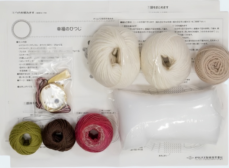 こちらは「幸福のひつじ」のあみぐるみキットです。キットには、複数色の毛糸(白、ベージュ、茶色、ピンク系など)、中棉、刺繍糸、小配件、そして詳細な作り方が記載された説明書がセットになっています。このキットを使って、写真のように、白い体にベージュの顔と手足、ブラウンの角を持ち、ピンクの花飾りとイエローのリボンが可愛らしいヒツジのぬいぐるみを自作することができます。出来上がったヒツジは表情が優しく、室内の飾りとしても、プレゼントとしてもぴったりです。