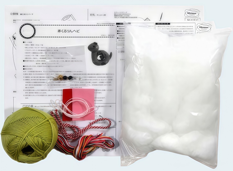 こちらは愛らしいヘビのあみぐるみキットです。キットには、緑色の毛糸、中棉、刺繍糸、縄、小物類、そして詳細な作り方が記載された説明書がセットになっています。このキットを使って、写真のように、頭に花飾り、体に可愛らしい刺繍や「巳」の赤いお守り風チャームが付いた、表情豊かなヘビのぬいぐるみを自作することができます。出来上がったヘビは、縁起物として飾ったり、特別なプレゼントとして贈ったりするのにぴったりです。